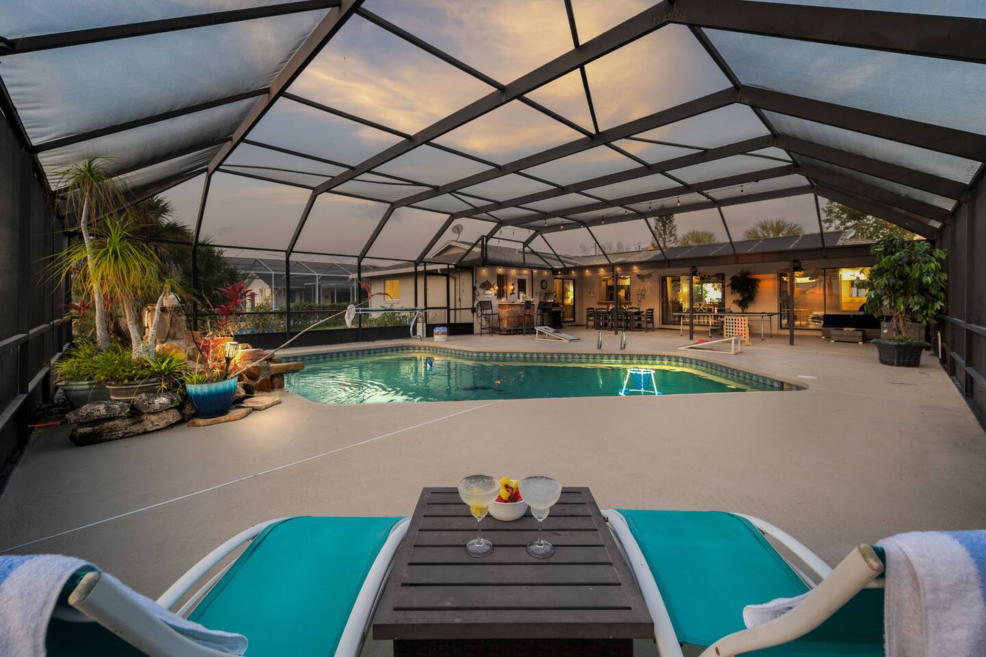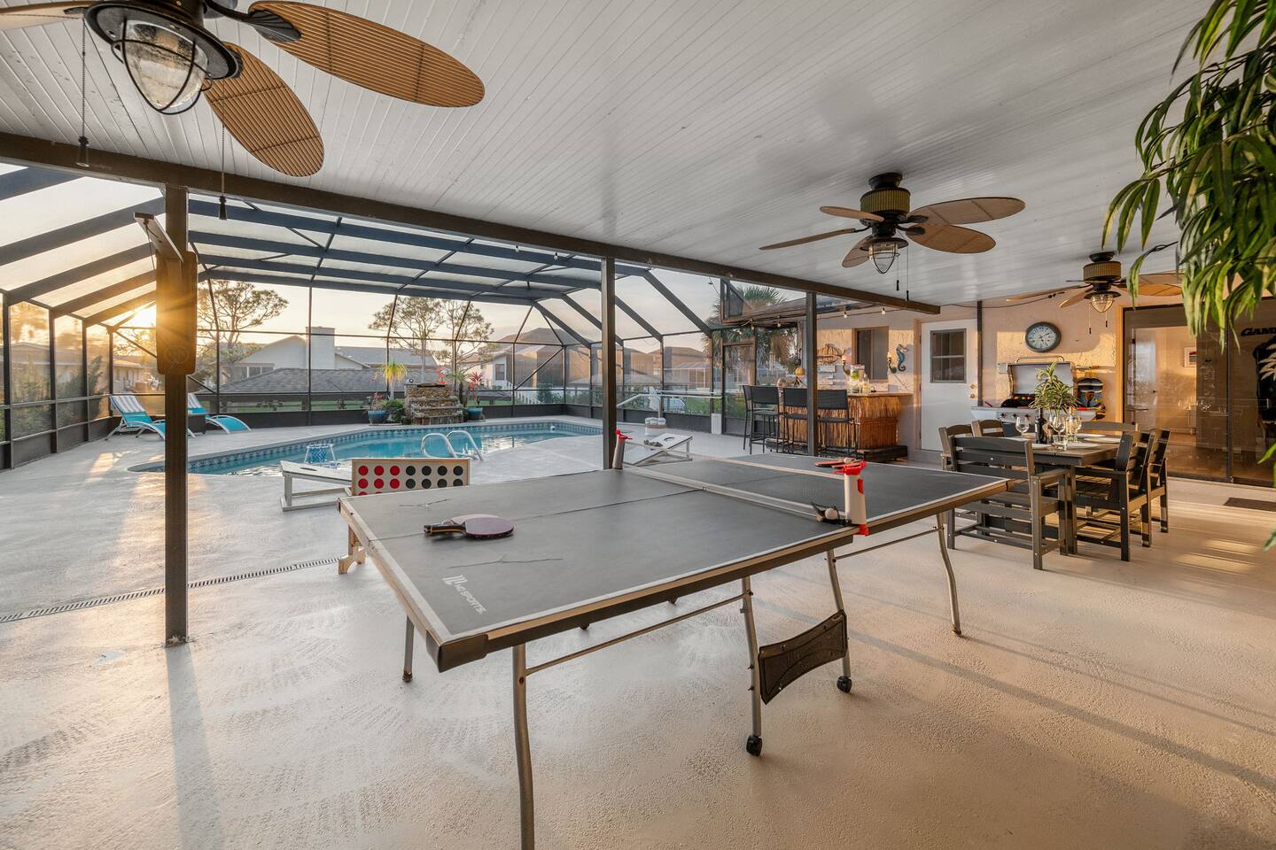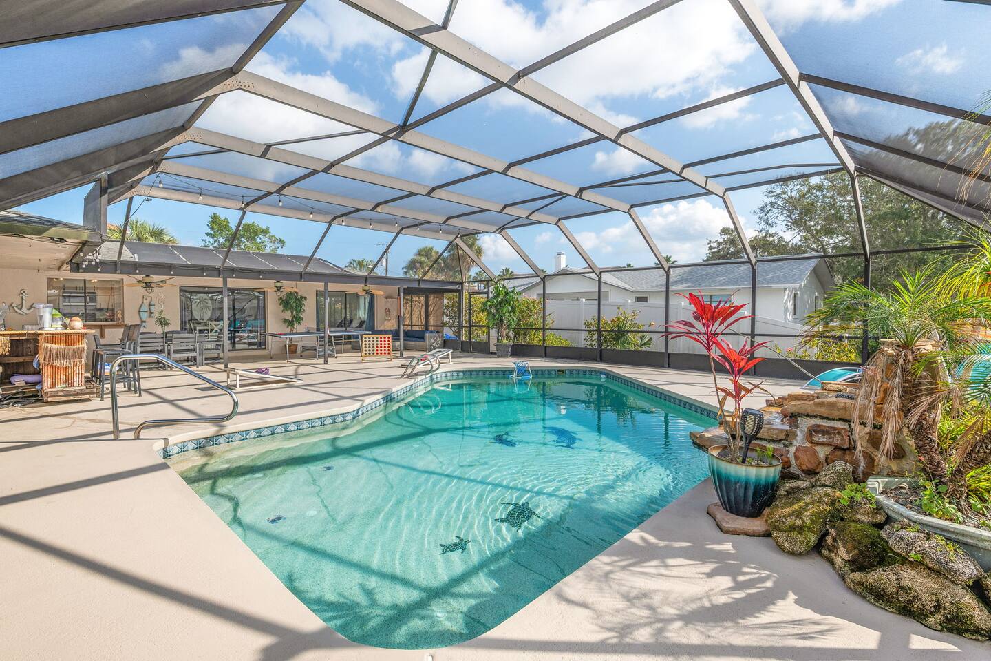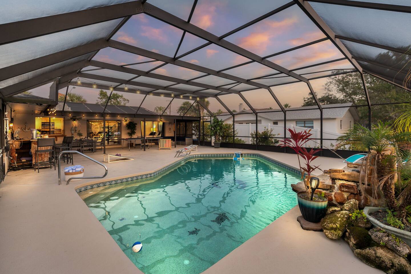 🌟 Home Highlights 🌊 Canal-front property with quick Intracoastal access 🚤 Under 30 seconds to the Intracoastal Waterway 🛶 Kayaks included – launch directly from the backyard 🍹 Tiki bar + margarita machine for poolside fun 🎮 Game room with arcade game 🏓 Outdoor ping pong table & foosball 🎲 Board games for all ages 🛏️ 3 bedrooms, 2 bathrooms – family-friendly layout 🌴 Massive backyard with plenty of space to relax 🎣 Perfect for fishing lovers & boaters 🛋️ Professionally designed with clean, modern coastal vibes 🚗 Driveway parking available 🛋️ More About the Space 🛋️ Bright living room with Smart TV and comfortable seating 🍳 Fully stocked kitchen with modern appliances 🍽️ Dining area ideal for family meals and game nights 🛏️ Primary bedroom with cozy bedding and modern finishes 🛌 Guest bedrooms designed for comfort and families 🎮 Game room and arcade setup for kids and adults 🍹 Backyard tiki bar and margarita machine for entertaining 🏓 Outdoor ping pong and foosball for nonstop fun 🛶 Canal access perfect for kayaking and fishing 📶 Fast Wi-Fi throughout the home 📍 Nearby Activities & Attractions ⭐ Crescent Watersports – boat rentals, dolphin tours & fishing charters (pickup available at the house) 🚤 Intracoastal Waterway – immediate boating access 🎣 Fishing directly from the canal 🚲 Lehigh Trail – biking, jogging & scenic walks 🏖️ Flagler Beach – pier, surf, dining & shops ⛳ Palm Harbor Golf Club – top-rated public course 🏖️ Jungle Hut Beach – quiet, scenic beach access 🌇 Historic St. Augustine – perfect day trip 🍽️ Top Local Restaurants 🍝 Osteria Rustica Italian — Upscale Italian dining with authentic flavors 🍖 Captain’s BBQ — Award-winning BBQ on the Intracoastal 🍽️ Atlantic Grille — Refined coastal cuisine with ocean views 🍺 Next Door Beach Bistro & Bar — Laid-back beachside dining and cocktails 🍤 Tortugas Kitchen & Bar — Seafood, tacos, and live music 🍳 Rodie’s Place — Local favorite for breakfast and brunch 🍕 Bronx House Pizza — Authentic New York–style pizza 🍩 Swillerbees Donuts — Gourmet donuts and great coffee 🔥 Pool Heating Policy Please Note: There is a $25 per day charge for heating the pool during the months of November through March. Pool heat must be requested in advance of arrival and will be charged for the full duration of the stay once activated. 🚤 Dock & Boat Slip Notice Please note that the dock is currently under repair. The dock is still usable for general access; however, it is warped at this time, and the boat slip is not functional. Guests may still enjoy the canal-front setting, kayaking, and water views, but boat docking at the slip is unavailable until repairs are completed.