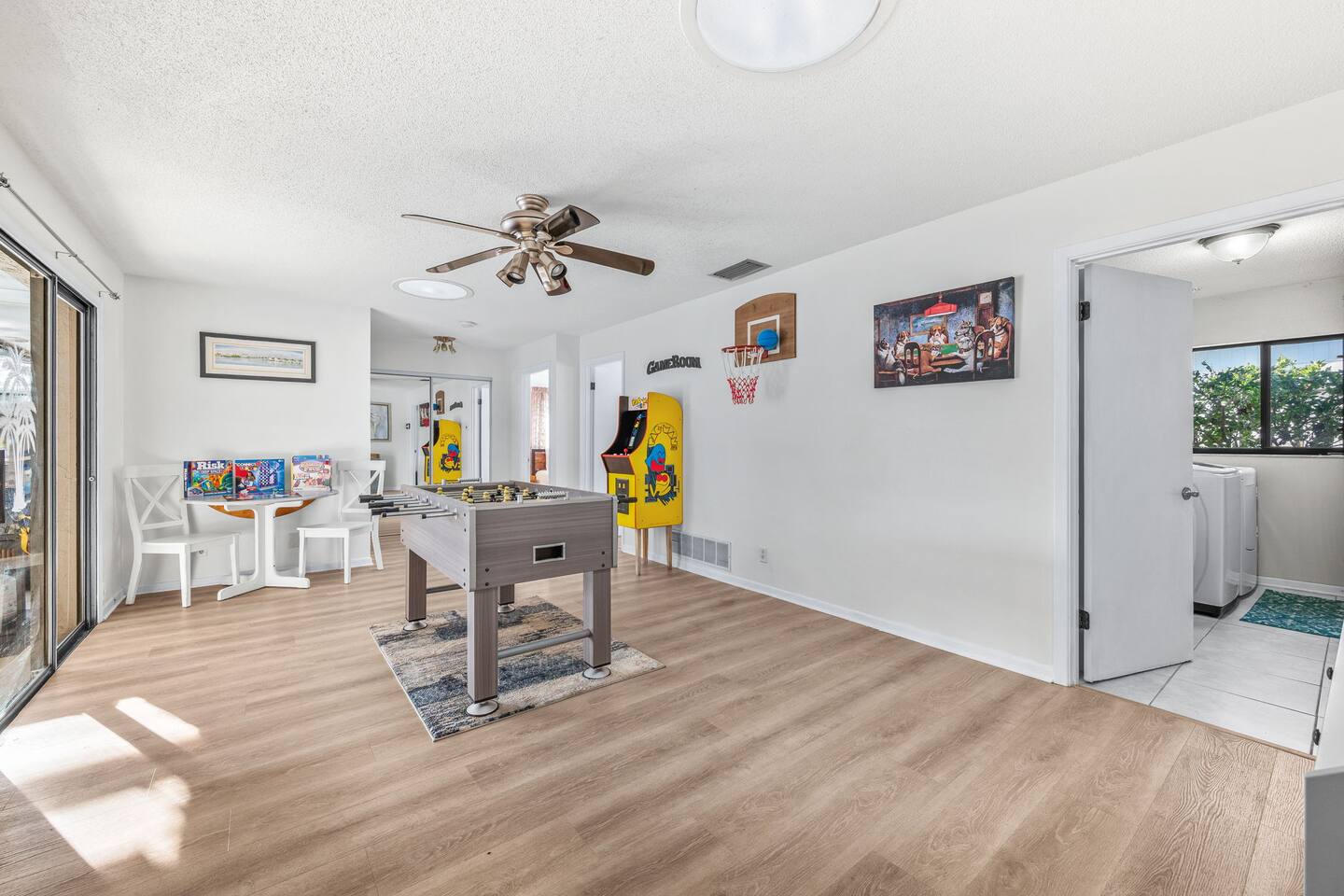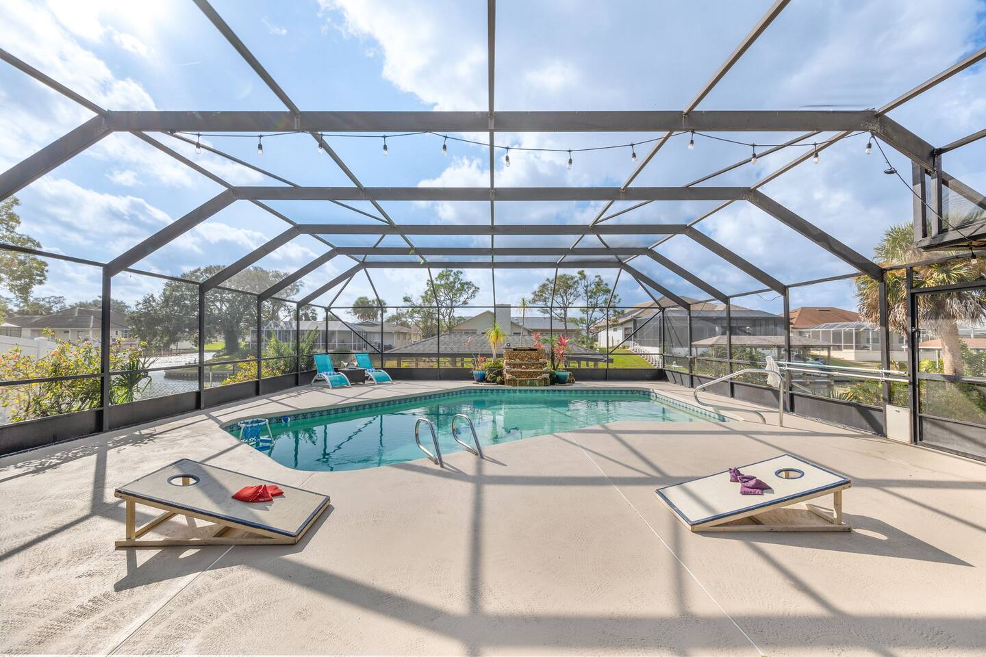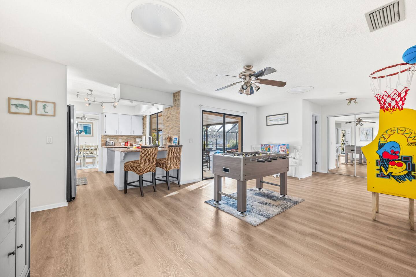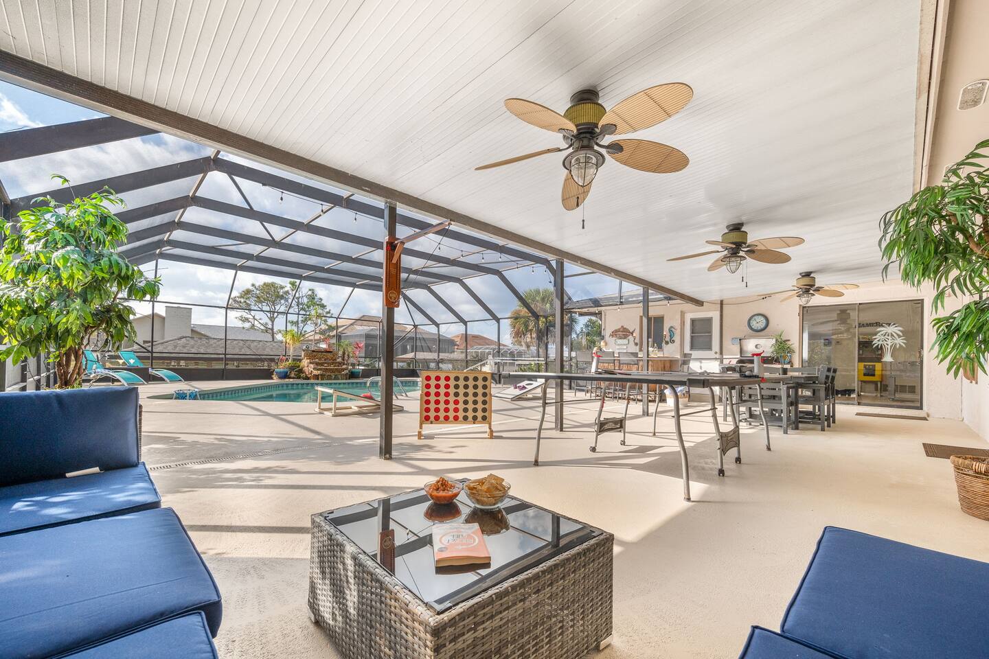 🌟 Home Highlights 🌊 Canal-front property with quick Intracoastal access 🚤 Under 30 seconds to the Intracoastal Waterway 🛶 Kayaks included – launch directly from the backyard 🍹 Tiki bar + margarita machine for poolside fun 🎮 Game room with arcade game 🏓 Outdoor ping pong table & foosball 🎲 Board games for all ages 🛏️ 3 bedrooms, 2 bathrooms – family-friendly layout 🌴 Massive backyard with plenty of space to relax 🎣 Perfect for fishing lovers & boaters 🛋️ Professionally designed with clean, modern coastal vibes 🚗 Driveway parking available 🛋️ More About the Space 🛋️ Bright living room with Smart TV and comfortable seating 🍳 Fully stocked kitchen with modern appliances 🍽️ Dining area ideal for family meals and game nights 🛏️ Primary bedroom with cozy bedding and modern finishes 🛌 Guest bedrooms designed for comfort and families 🎮 Game room and arcade setup for kids and adults 🍹 Backyard tiki bar and margarita machine for entertaining 🏓 Outdoor ping pong and foosball for nonstop fun 🛶 Canal access perfect for kayaking and fishing 📶 Fast Wi-Fi throughout the home 📍 Nearby Activities & Attractions ⭐ Crescent Watersports – boat rentals, dolphin tours & fishing charters (pickup available at the house) 🚤 Intracoastal Waterway – immediate boating access 🎣 Fishing directly from the canal 🚲 Lehigh Trail – biking, jogging & scenic walks 🏖️ Flagler Beach – pier, surf, dining & shops ⛳ Palm Harbor Golf Club – top-rated public course 🏖️ Jungle Hut Beach – quiet, scenic beach access 🌇 Historic St. Augustine – perfect day trip 🍽️ Top Local Restaurants 🍝 Osteria Rustica Italian — Upscale Italian dining with authentic flavors 🍖 Captain’s BBQ — Award-winning BBQ on the Intracoastal 🍽️ Atlantic Grille — Refined coastal cuisine with ocean views 🍺 Next Door Beach Bistro & Bar — Laid-back beachside dining and cocktails 🍤 Tortugas Kitchen & Bar — Seafood, tacos, and live music 🍳 Rodie’s Place — Local favorite for breakfast and brunch 🍕 Bronx House Pizza — Authentic New York–style pizza 🍩 Swillerbees Donuts — Gourmet donuts and great coffee 🔥 Pool Heating Policy Please Note: There is a $25 per day charge for heating the pool during the months of November through March. Pool heat must be requested in advance of arrival and will be charged for the full duration of the stay once activated. 🚤 Dock & Boat Slip Notice Please note that the dock is currently under repair. The dock is still usable for general access; however, it is warped at this time, and the boat slip is not functional. Guests may still enjoy the canal-front setting, kayaking, and water views, but boat docking at the slip is unavailable until repairs are completed.