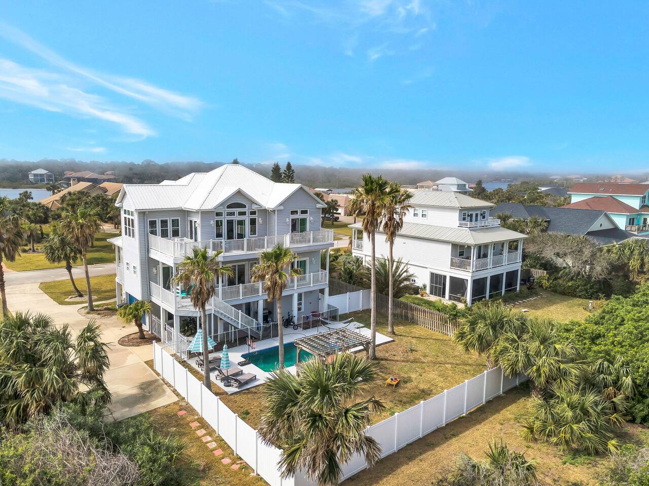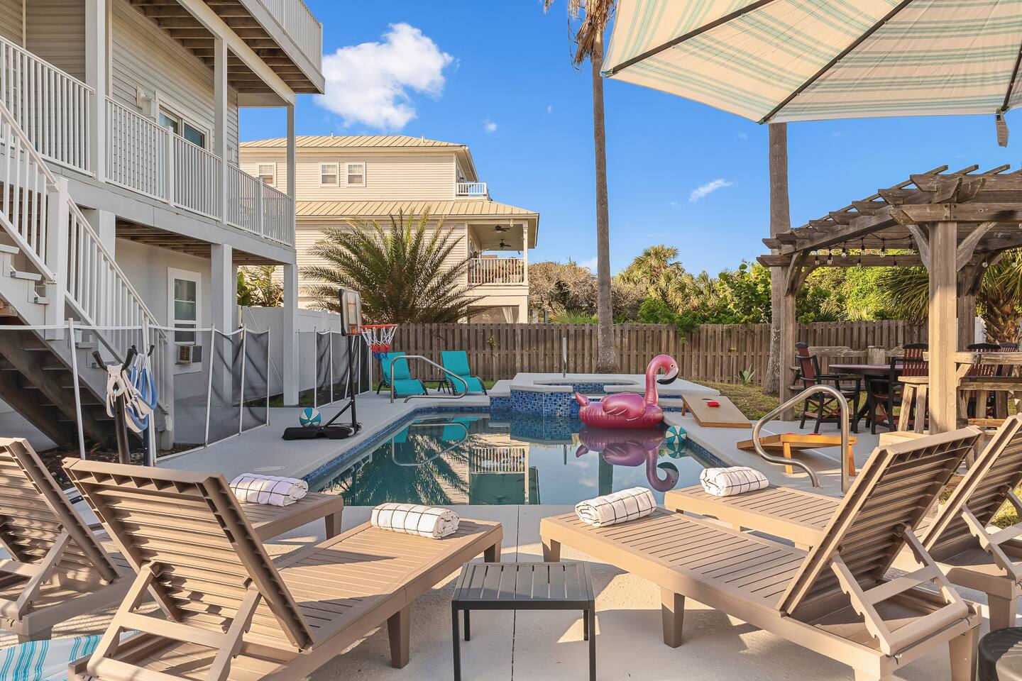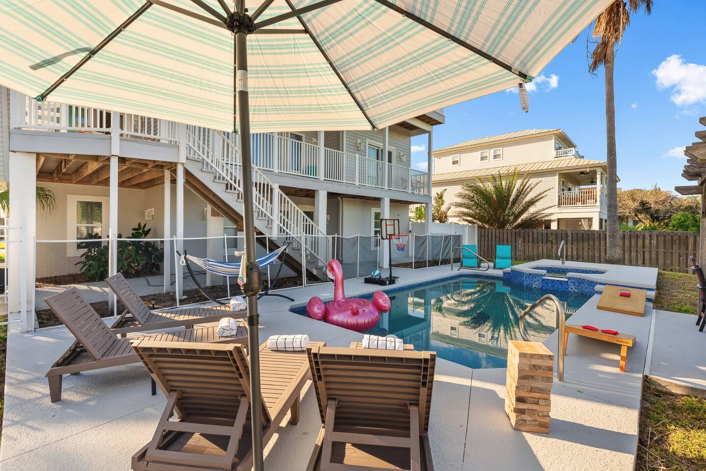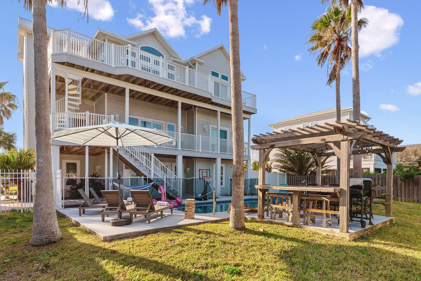 Experience luxury and relaxation at this 3-story vacation rental across from Flagler Beach, just a 5-minute drive to the Flagler Beach Pier and Boardwalk. Designed for family getaways, this home sleeps 14 and features king beds in every room plus a kids’ bunk room with a foosball table. Enjoy a private pool with basketball, a fire pit, a hammock, and a BBQ. Relax on two large balconies, or challenge the family to life-size games and pool. Your perfect Flagler Beach retreat awaits!