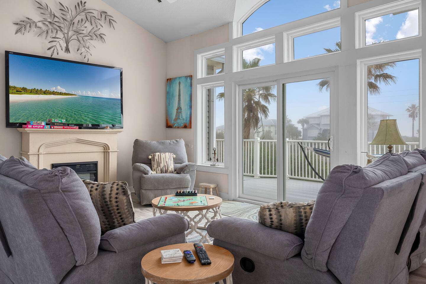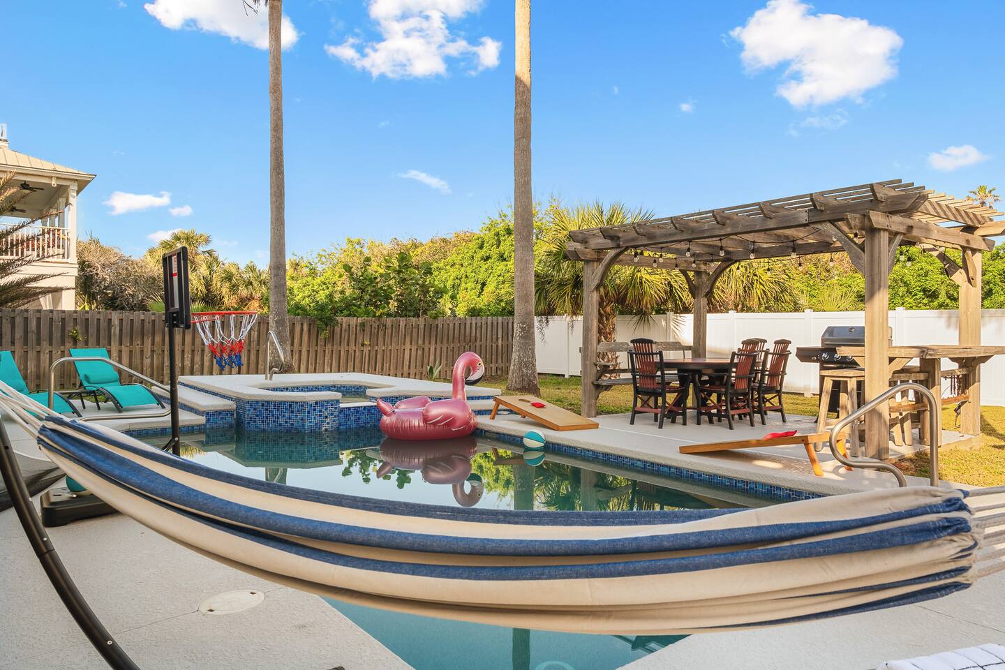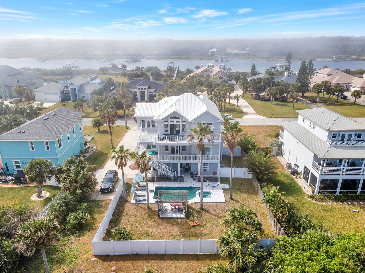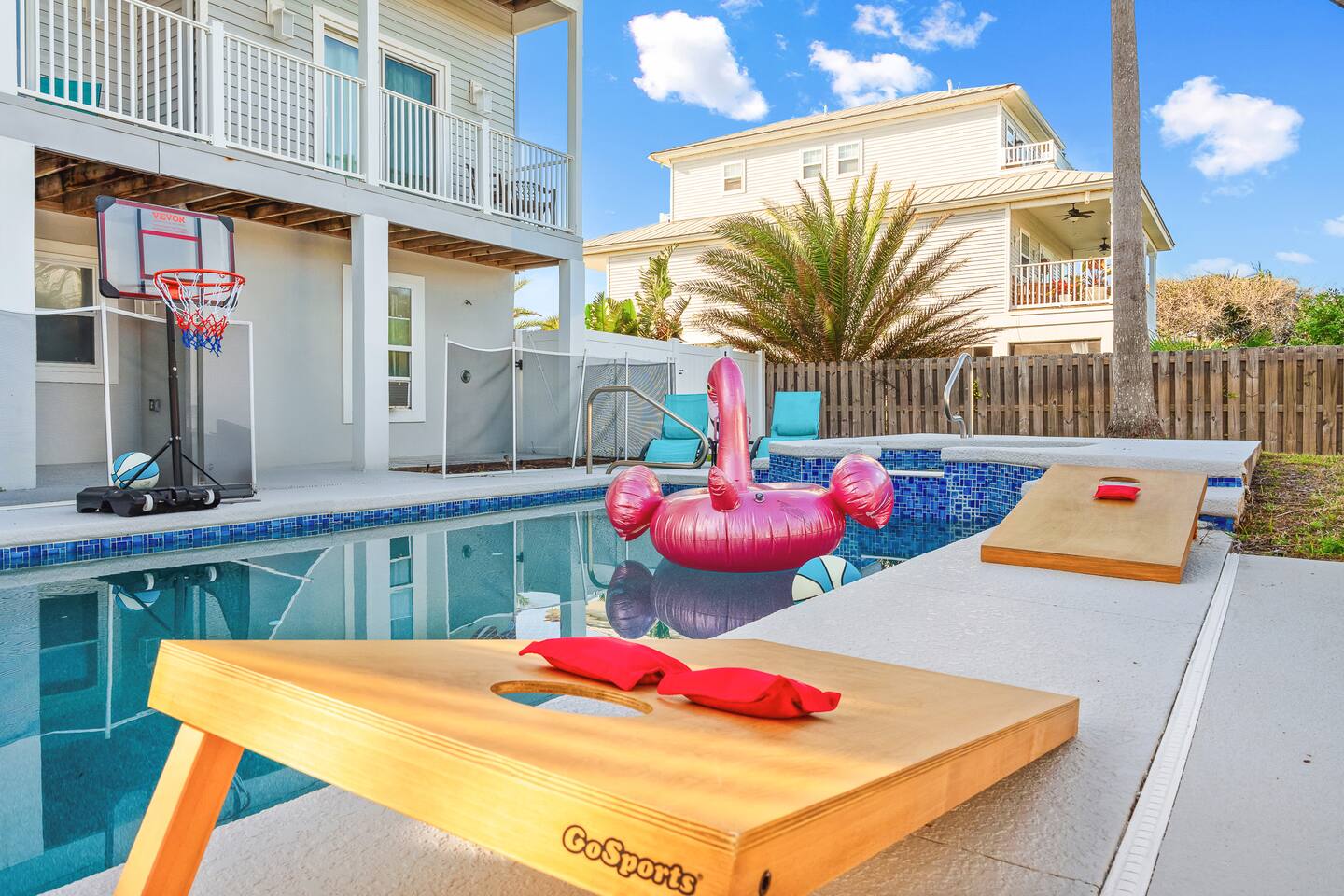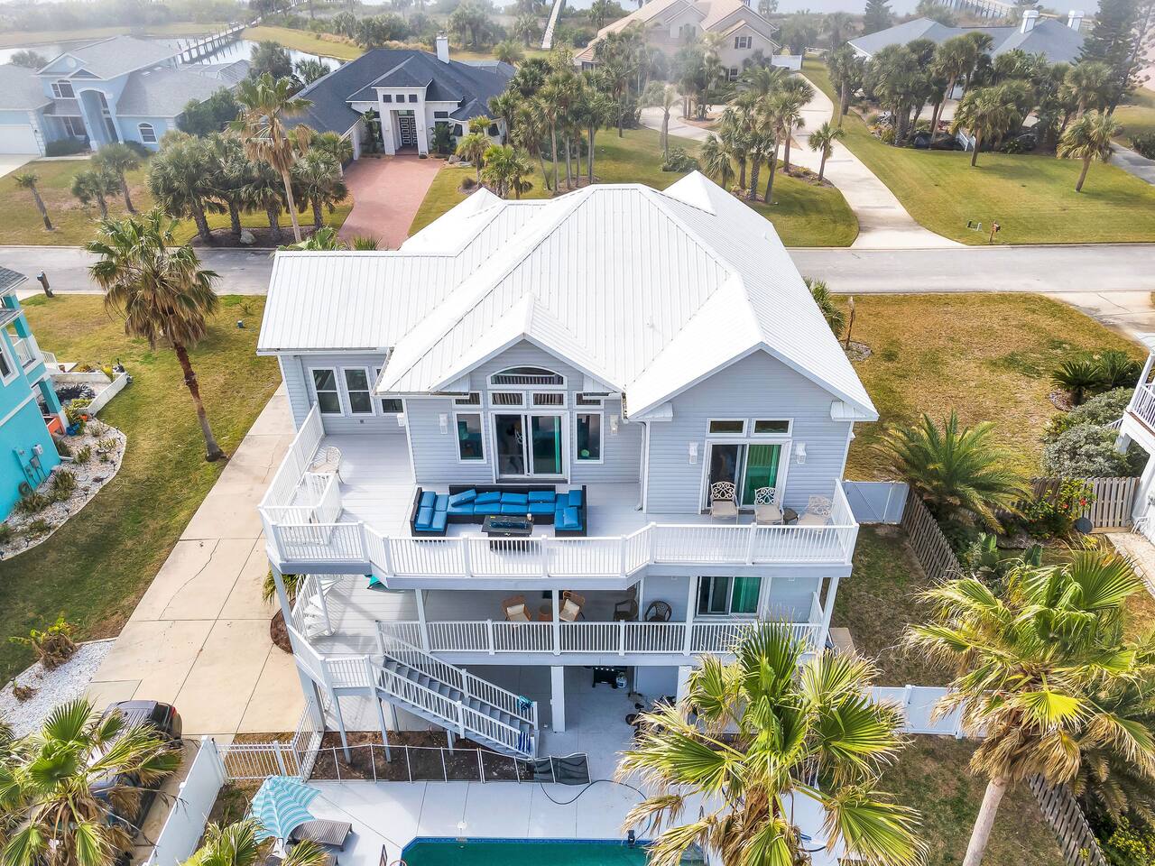 Experience luxury and relaxation at this 3-story vacation rental across from Flagler Beach, just a 5-minute drive to the Flagler Beach Pier and Boardwalk. Designed for family getaways, this home sleeps 14 and features king beds in every room plus a kids’ bunk room with a foosball table. Enjoy a private pool with basketball, a fire pit, a hammock, and a BBQ. Relax on two large balconies, or challenge the family to life-size games and pool. Your perfect Flagler Beach retreat awaits!